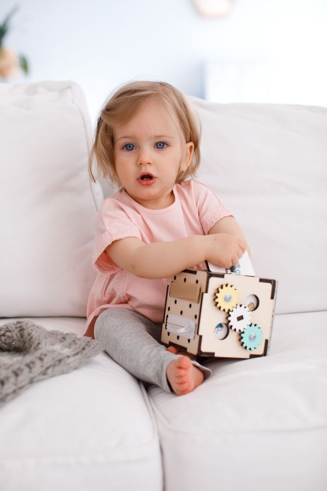 Deze compacte activiteitenkubus biedt uren speelplezier en stimuleert tegelijk de fijne motoriek, logisch denken en zelfstandigheid.